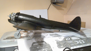 So, over the last few nights, I have been spraying some Alclad on the underside of the fuselage before masking it off along with the wings to spray them with some Gloss Black. The actual aircraft was painted in Matt Black, but I used the Gloss just for laying the decals on it before finishing it off with some Matt Varnish. The tail and the engine covers still need to have some Red airbrushed on them before I start on the decals. There is also a few other items that need painting first before I fix the wings into place on the fuselage and start adding decals.